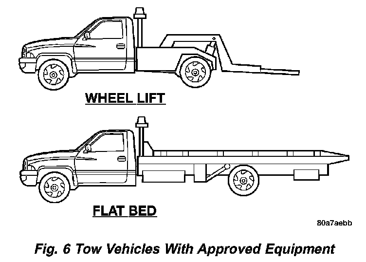 A vehicle equipped with SAE approved wheel lift- type towing equipment can be used to tow Jeep vehicles. When towing a 4WD vehicle using a wheel-lift towing device, use tow dollies under the opposite end of the vehicle. A vehicle with flatbed device can also be used to transport a disabled vehicle (Fig. 6).