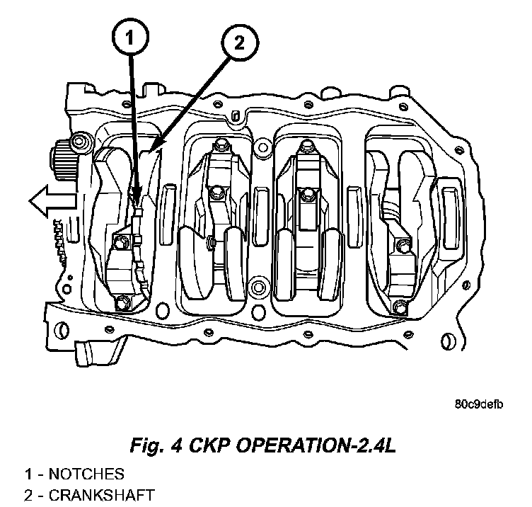 Engine speed and crankshaft position are provided through the CKP (Crankshaft Position) sensor. The sensor generates pulses that are the input sent to the Powertrain Control Module (PCM). The PCM interprets the sensor input to determine the crankshaft position. The PCM then uses this position, along with other inputs, to determine injector sequence and ignition timing.