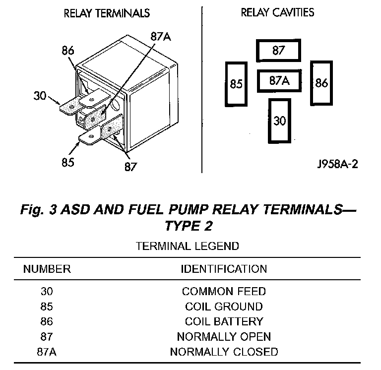 The following description of operation and tests apply only to the Automatic Shutdown (ASD) and fuel pump relays. The terminals on the bottom of each relay are numbered. Two different types of relays may be used, or.