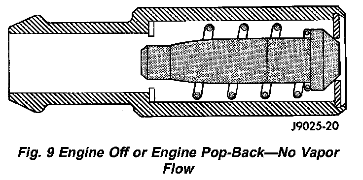 When the engine is not operating, or during an engine pop-back, the spring forces the plunger back against the seat. This will prevent vapors from flowing through the valve.