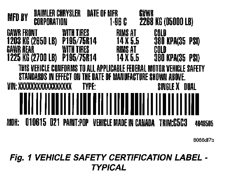 A vehicle safety certification label (Fig. 1) is attached to every Daimlerchrysler Corporation vehicle. The label certifies that the vehicle conforms to all applicable Federal Motor Vehicle Safety Standards. The label also lists: