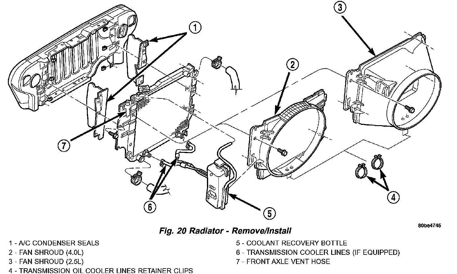 10. Lift radiator straight up and out of vehicle taking care not to damage radiator fins.