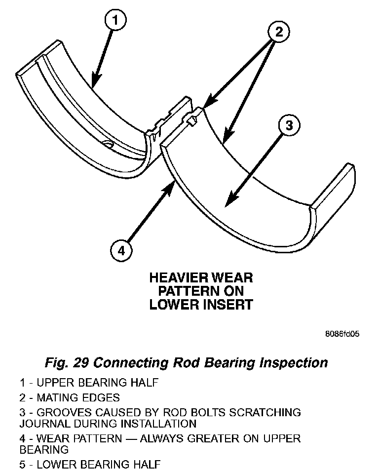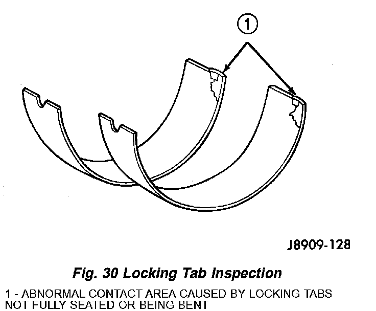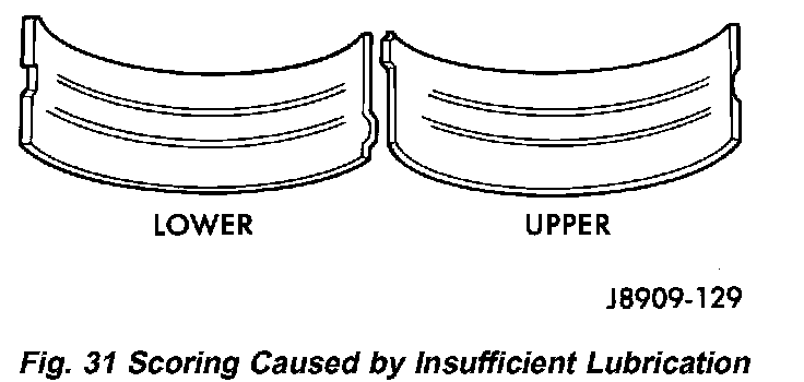 Inspect the connecting rod bearings for scoring and bent alignment tabs (Fig. 29) (Fig. 30). Check the bearings for normal wear patterns, scoring, grooving, fatigue and pitting (Fig. 31). Replace any bearing that shows abnormal wear.