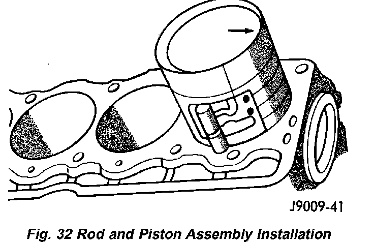 4. Use piston ring compressor to install the rod and piston assemblies. The oil squirt holes in the rods must face the camshaft. The arrow on the piston crown should point to the front of the engine (Fig. 32). Verify that the oil squirt holes in the rods face the camshaft and that the arrows on the pistons face the front of the engine.