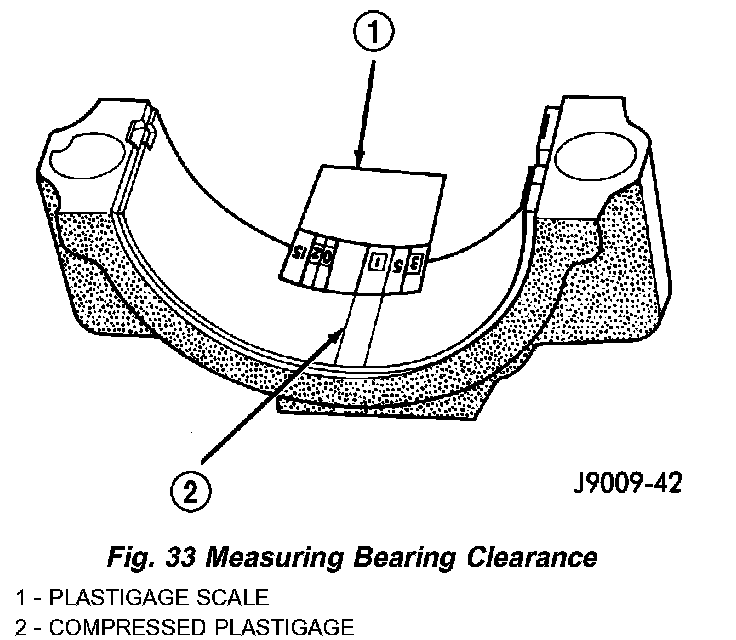 7. Remove the bearing cap and determine amount of bearing-to-journal clearance by measuring the width of compressed Plastigage (Fig. 33).Plastigage should indicate the same clearance across the entire width of the insert. If the clearance varies, it may be caused by either a tapered journal, bent connecting rod or foreign material trapped between the insert and cap or rod.