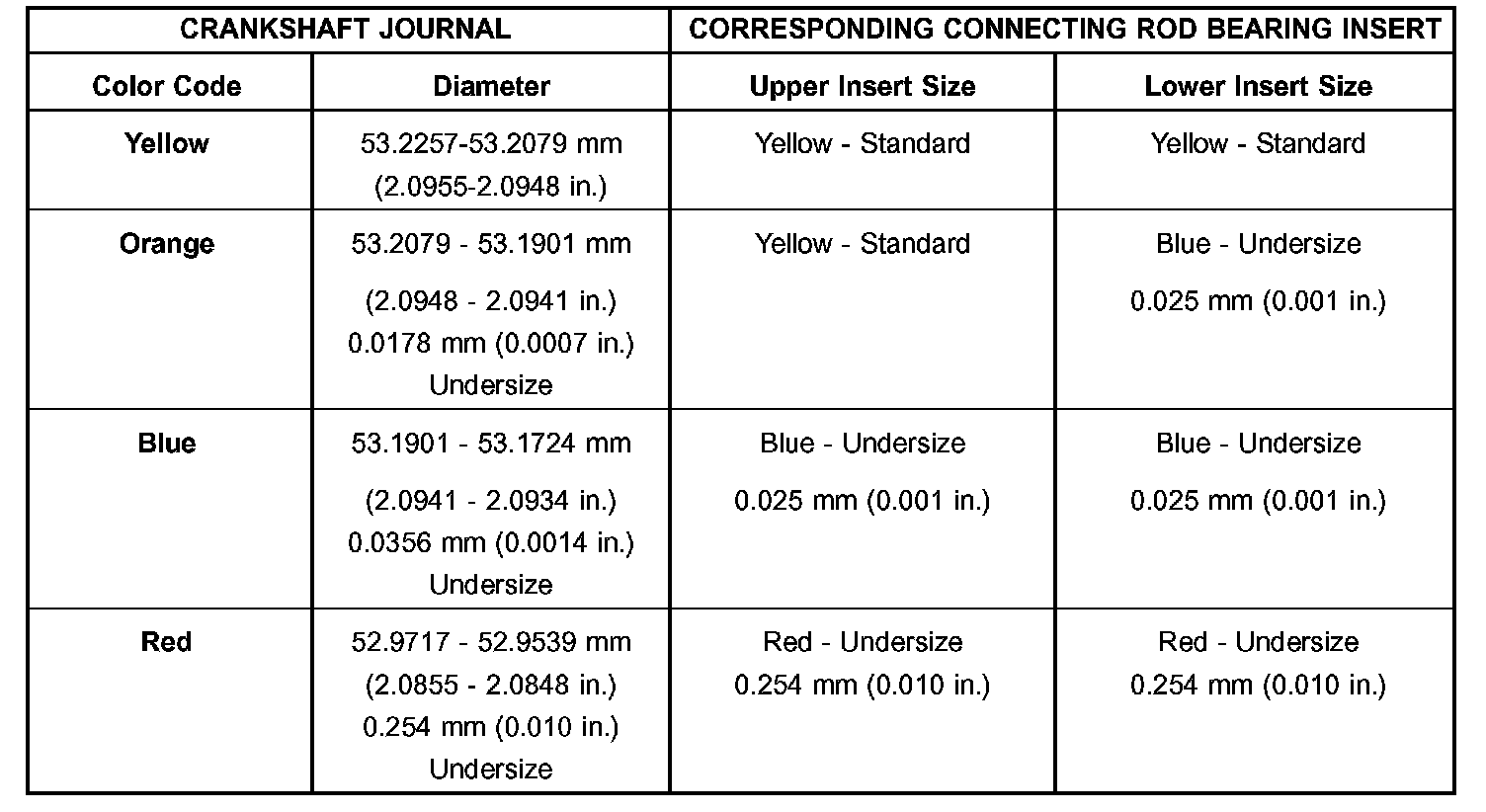 11. FOR EXAMPLE: If the initial clearance was 0.0762 mm (0.003 inch), 0.025 mm (0.001 inch) undersize inserts would reduce the clearance by 0.025 mm (0.001 inch). The clearance would be 0.002 inch and within specification. A 0.051 mm (0.002 inch) undersize insert would reduce the initial clearance an additional 0.013 mm (0.0005 inch). The clearance would then be 0.038 mm (0.0015 inch).