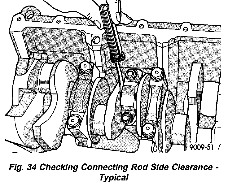 13. Once you have selected the proper insert, install the insert and cap. Tighten the connecting rod bolts to 45 Nm (33 ft. lbs.) torque. Slide snug-fitting feeler gauge between the connecting rod and crankshaft journal flange (Fig. 34). Replace the connecting rod if the side clearance is not within specification.