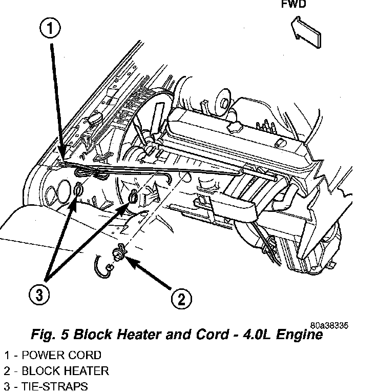 5. Plug power cord into block heater. Route cord away from moving parts, linkages and exhaust system components. Secure cord in place with tie-straps.