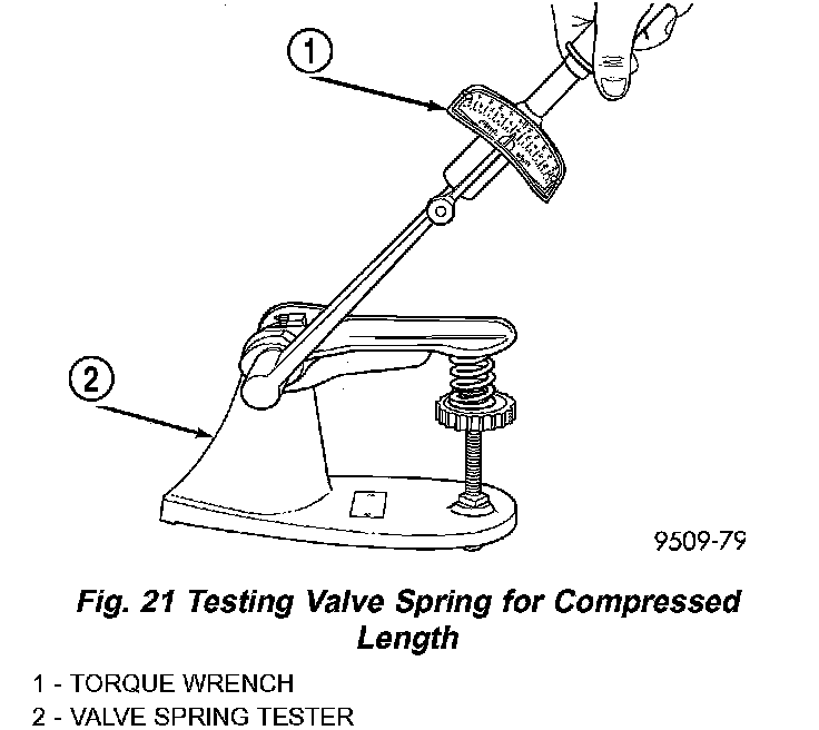 STANDARD PROCEDURE-VALVE SPRING TESTINGWhenever valves have been removed for inspection, reconditioning or replacement, valve springs should be tested. As an example the compression length of the spring to be tested is 1-5/16 inch. Turn table of Universal Valve Spring Tester Tool until surface is in line with the 1-5/16 in. mark on the threaded stud. Be sure the zero mark is to the front (Fig. 21). Place spring over stud on the table and lift compressing lever to set tone device. Pull on torque wrench until ping is heard. Take reading on torque wrench at this instant. Multiply this reading by 2. This will give the spring load at test length. Fractional measurements are indicated on the table for finer adjustments. Discard the springs that do not meet specifications.