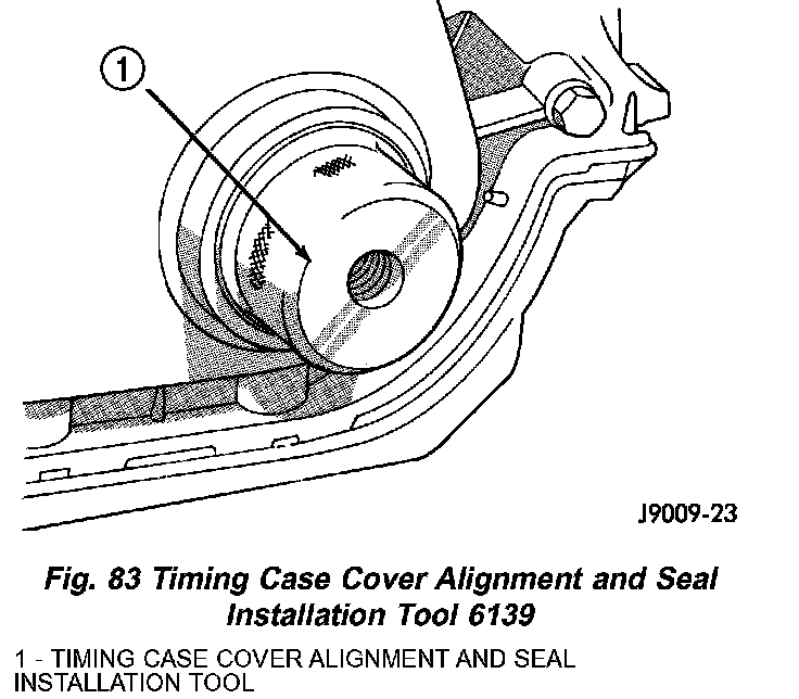 5. Insert Timing Case Cover Alignment and Seal Installation Tool 6139 in the crankshaft opening in the cover (Fig. 83).