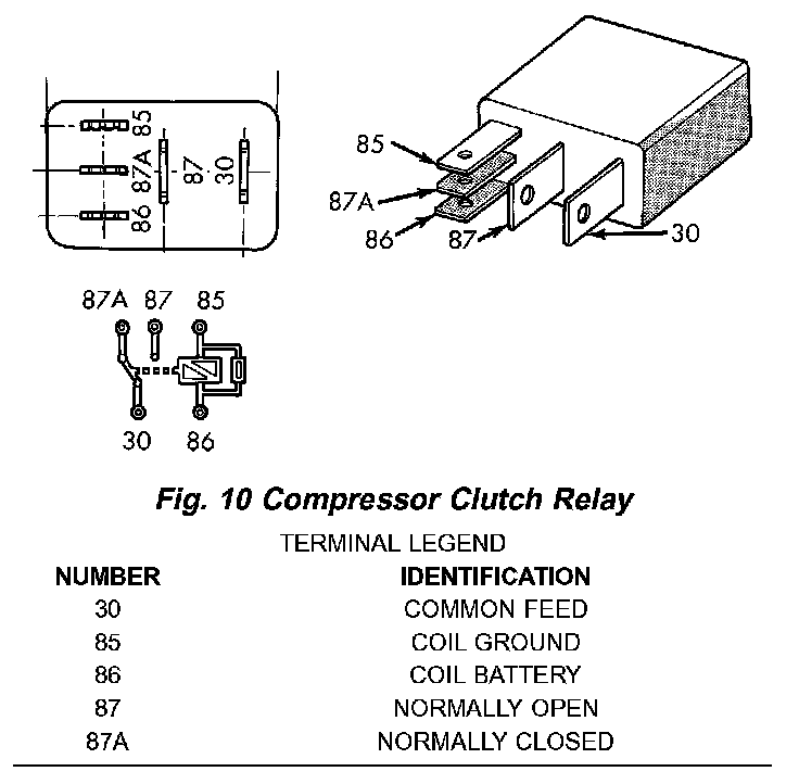 For circuit descriptions and diagrams, refer to the appropriate wiring information. The wiring information includes wiring diagrams, proper wire and connector repair procedures, further details on wire harness routing and retention, as well as pin-out and location views for the various wire harness connectors, splices and grounds.Fig.10 Compressor Clutch Relay: