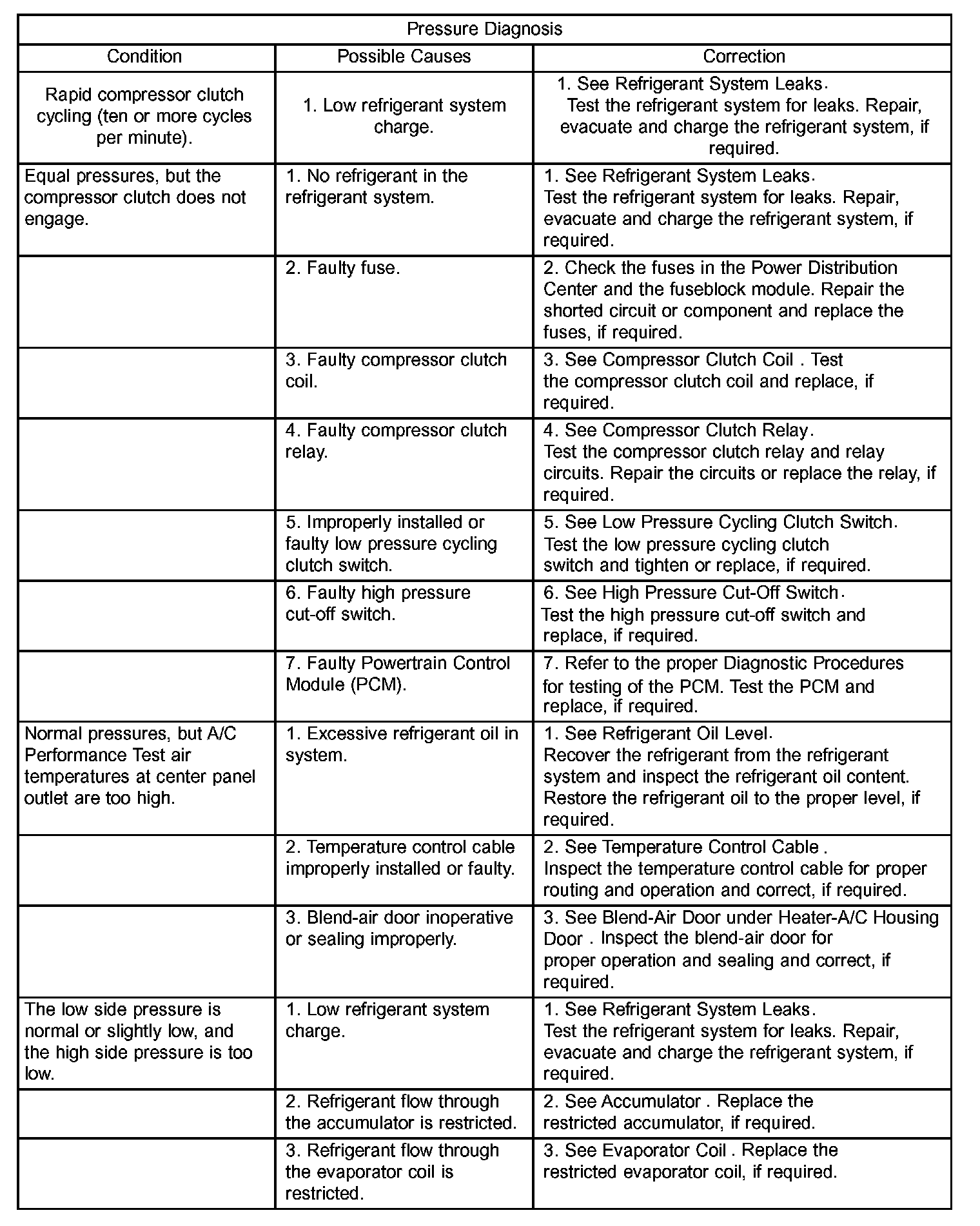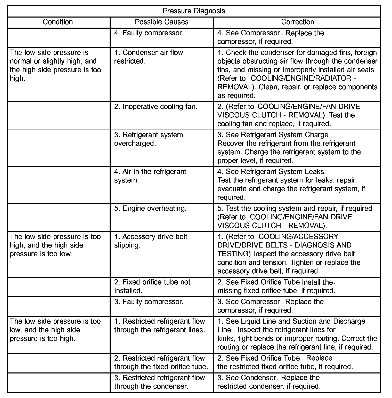 9. Compare the compressor discharge pressure to the Performance Temperature and Pressure chart. If the compressor discharge pressure is high, see the Pressure Diagnosis chart.