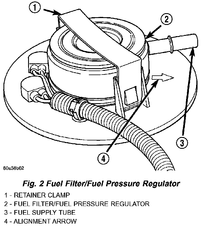 4. Remove retainer clamp from top of filter/regulator (Fig. 2). Clamp snaps to tabs on pump module. Discard old clamp.