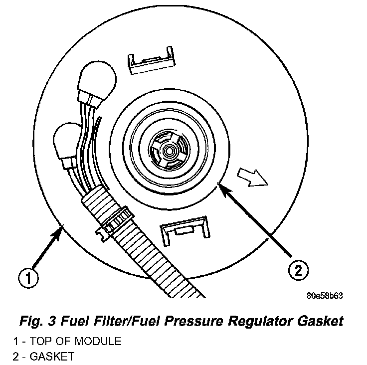 6. The molded arrow (Fig. 2) on top of fuel pump module should be pointed towards front of vehicle (12 o'clock position).