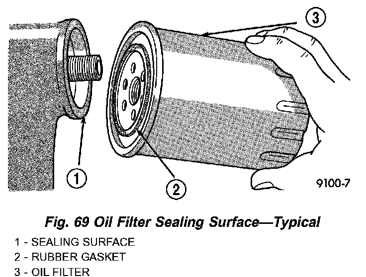 5. Make sure old gasket comes off with oil filter. With a wiping cloth, clean the gasket sealing surface (Fig. 69) of oil and grime.