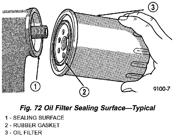 2. Thread filter onto adapter nipple. When gasket makes contact with sealing surface, (Fig. 72) hand tighten filter one full turn, do not over tighten.