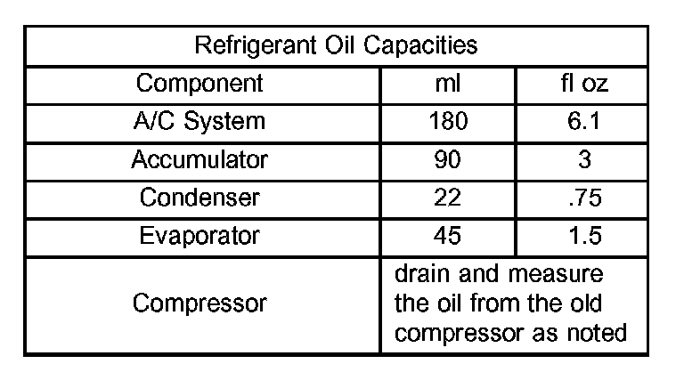 Refrigerant oil must be added when a accumulator, evaporator coil, or condenser are replaced. See the Refrigerant Oil Capacities chart. When a compressor is replaced, the refrigerant oil must be drained from the old compressor and measured. Drain all of the refrigerant oil from the new compressor, then fill the new compressor with the same amount of refrigerant oil that was drained out of the old compressor.