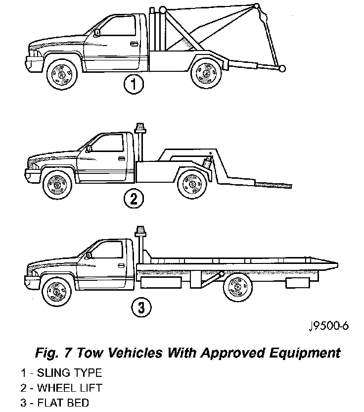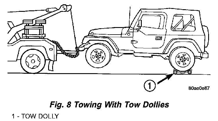 DaimlerChrysler Corporation recommends that a 4WD vehicle be transported on a flat-bed device. A Wheel-lift or front end attached Sling-type device can be used provided all the wheels are lifted off the ground using tow dollies (Fig. 7) and (Fig. 8).
