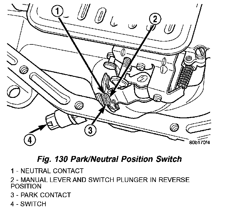 The [1][2]park/neutral position switch (Fig. 130) is threaded into the side of the transmission case, just above the transmission oil pan mounting surface. The center terminal of the park/neutral position switch is the starter-circuit terminal. It provides the ground for the starter solenoid circuit through the selector lever in PARK and NEUTRAL positions only The outer terminals on the switch are for the backup lamp circuit.