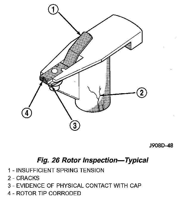 Some charring is normal on the end of the metal tip. The silicone-dielectric- varnish-compound applied to the rotor tip for radio interference noise suppression, will appear charred. This is normal. Do not remove the charred compound. Test the spring for insufficient tension. Replace a rotor that displays any of these adverse conditions.