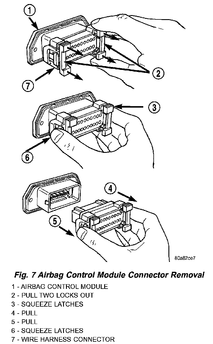 b. Squeeze the latch tabs on each side of the connector between the thumb and forefinger and pull the connector straight away from the ACM connector receptacle.