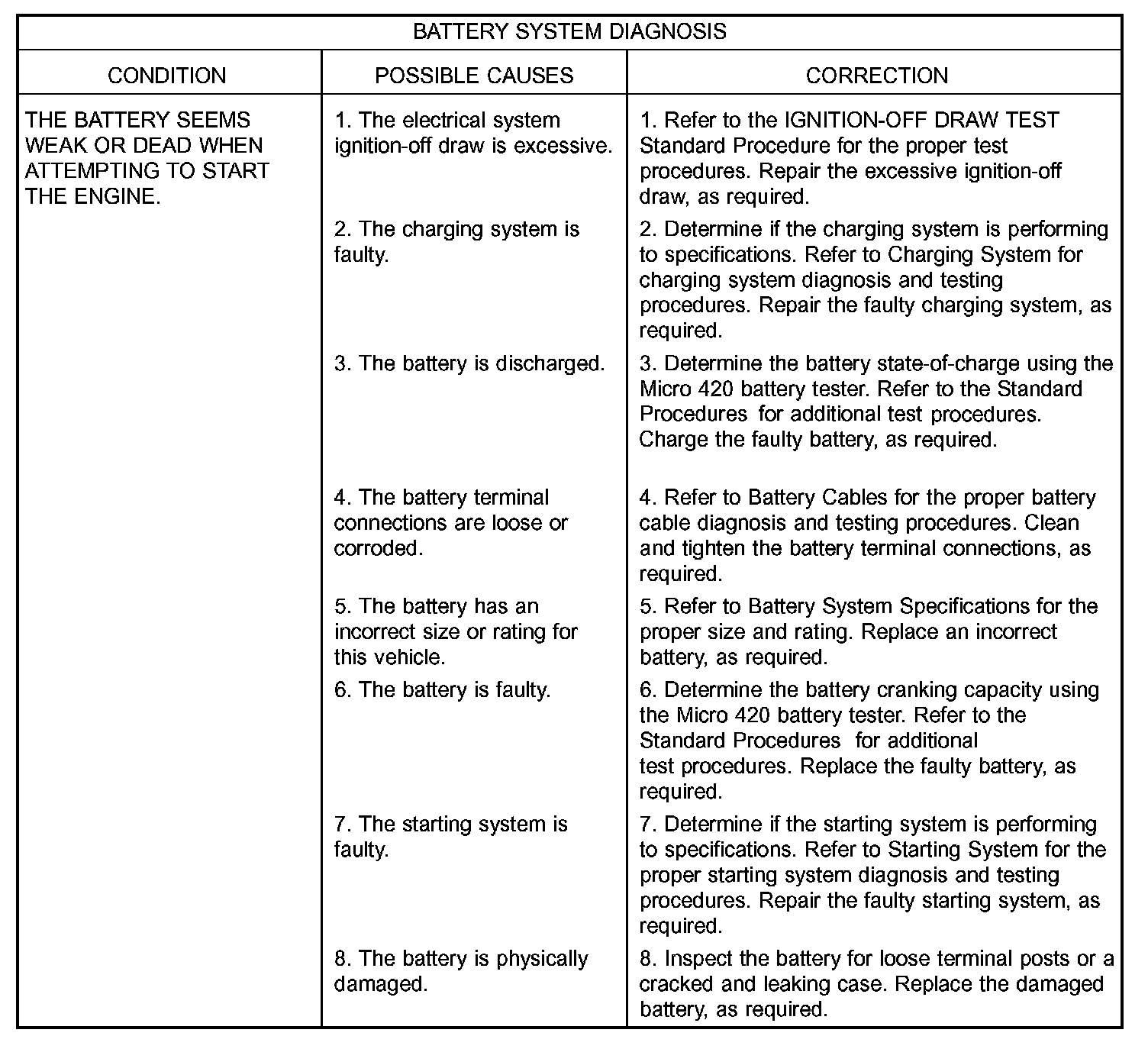 The Micro 420 automotive battery tester is designed to help the dealership technicians diagnose a defective battery. Follow the instruction manual supplied with the tester to properly diagnose a vehicle. If the instruction manual is not available refer to the standard procedure in this section, which includes the directions for using the Micro 420 electrical system tester.
