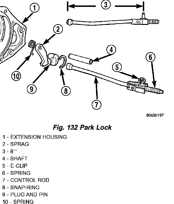2. Inspect square lug on sprag for broken edges. Check lugs on park gear for damage. Inspect knob on end of control rod for wear grooves, or being seized on rod. Replace rod if bent, if knob is worn/grooved, or it has seized on rod. Replace park gear if lugs are damaged. Replace the park lock rod if it is suspected that the rod is not the correct length.