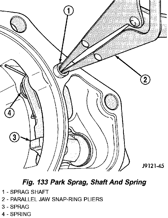 Examine the park lock components in the housing. If replacement is necessary, remove the shaft with parallel jaw snap-ring pliers (Fig. 133) and remove the sprag and spring. Then remove the spring clip and reaction plug (Fig. 134). Compress the reaction plug spring clip only enough to remove and install it. Do not distort the clip during removal or installation.