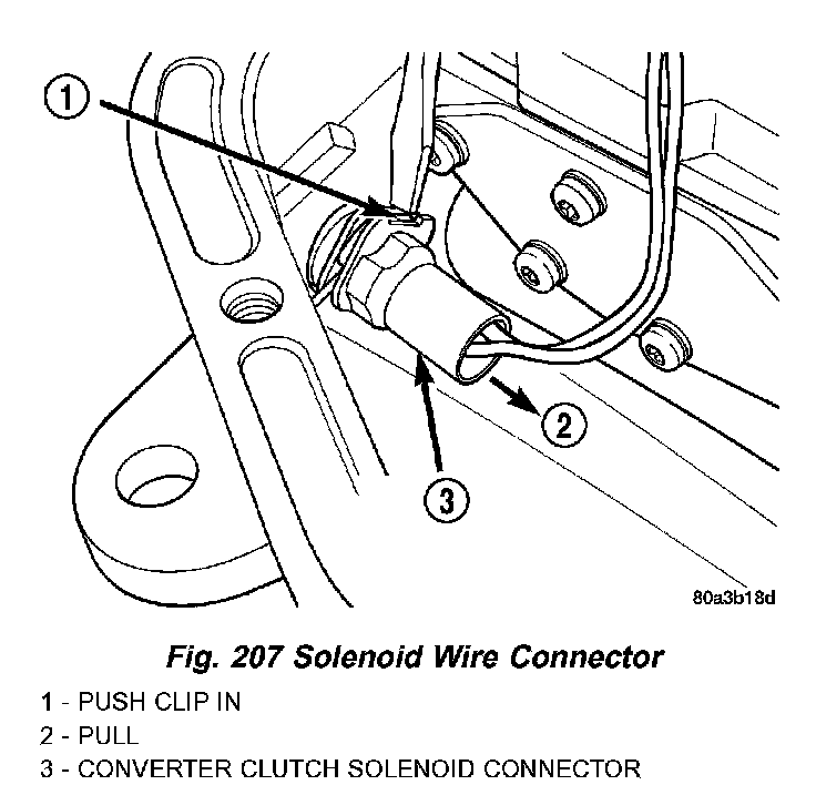 6. Depress retaining clip and pull solenoid wire from case connector (Fig. 207).