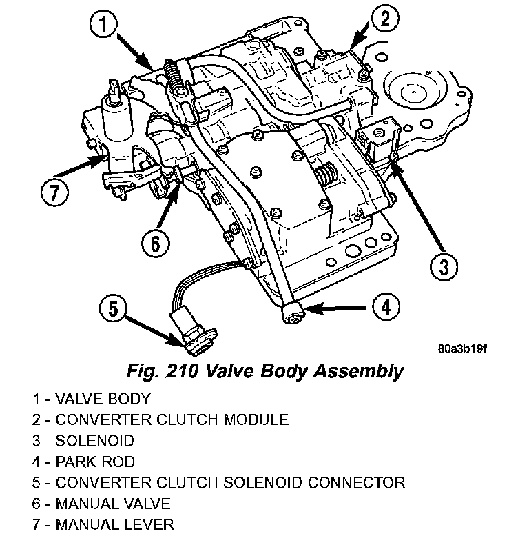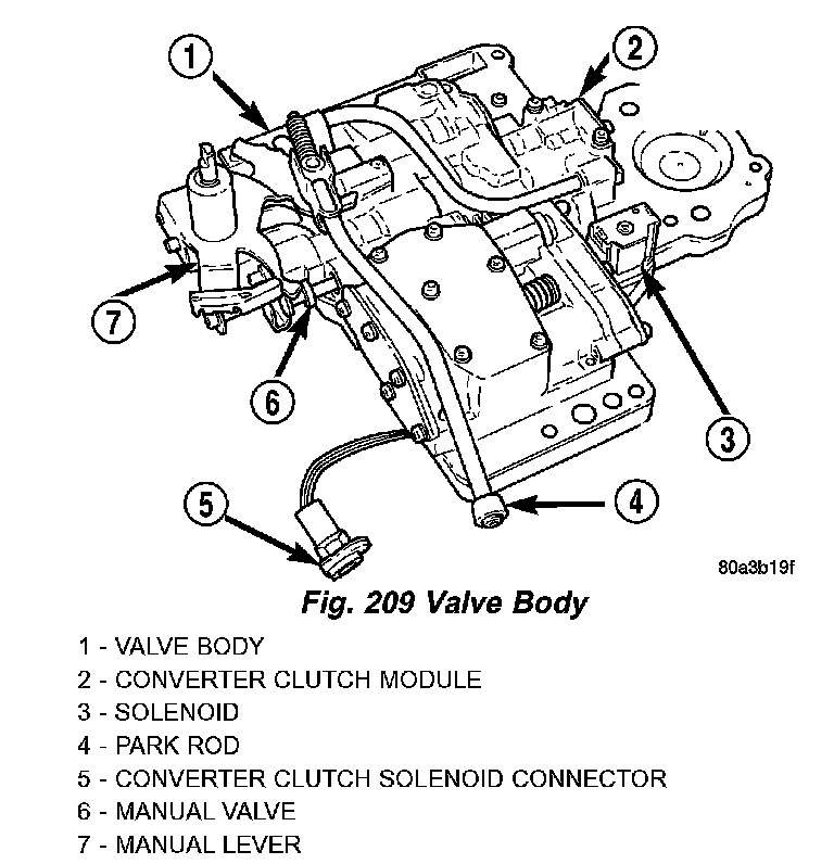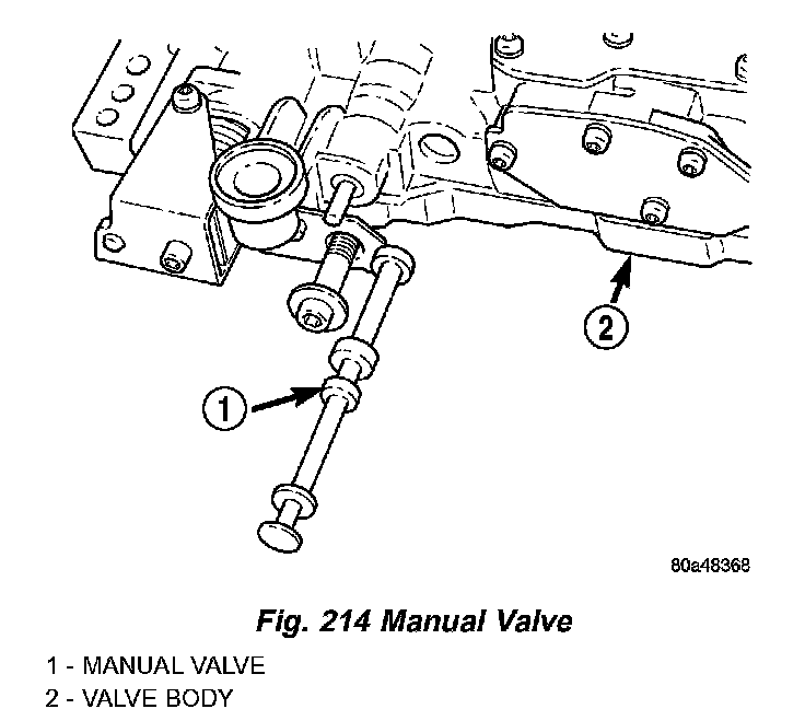 11. Lower valve body rotate it away from case, pull park lock rod out of sprag, and remove valve body (Fig. 209).