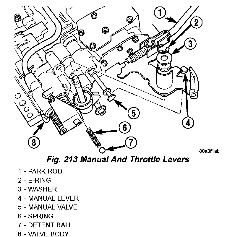 6. Pull manual shaft and park rod assembly upward out of valve body and off throttle lever (Fig. 213).