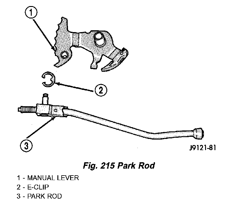 10. Remove park rod E-clip and separate rod from manual lever (Fig. 215).