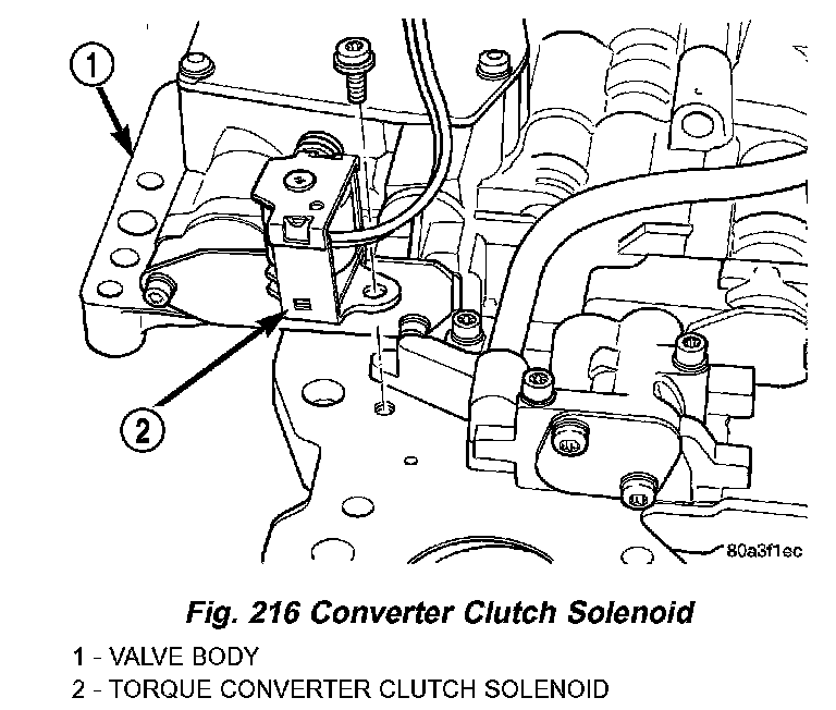 11. Remove converter clutch solenoid from separator plate (Fig. 216). A T25 torx bit is required to remove solenoid attaching screw.