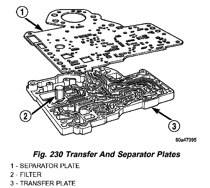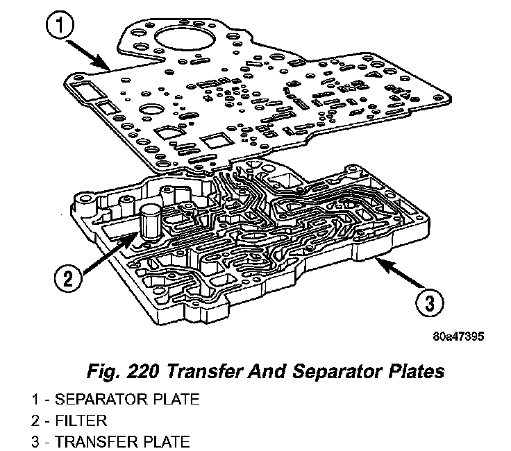 17. Remove transfer plate and separator plate from valve body (Fig. 219). Note position of filter and clutch solenoid for reference. Remove valve body check balls.