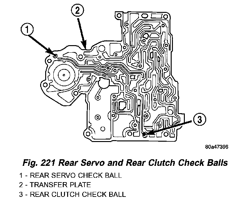 20. Note position of filter, rear clutch servo and rear servo check balls for assembly reference (Fig. 220) and (Fig. 221).