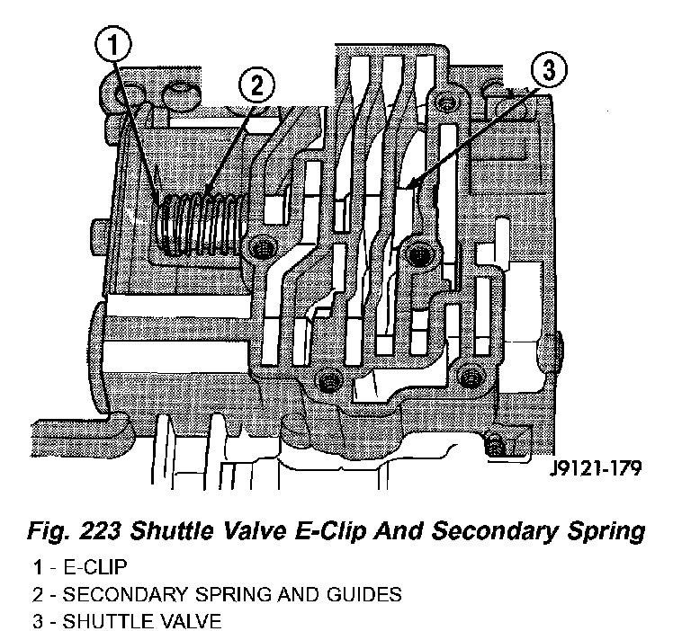 22. Remove shuttle valve E-clip and remove secondary spring and spring guides from end of valve (Fig. 223).