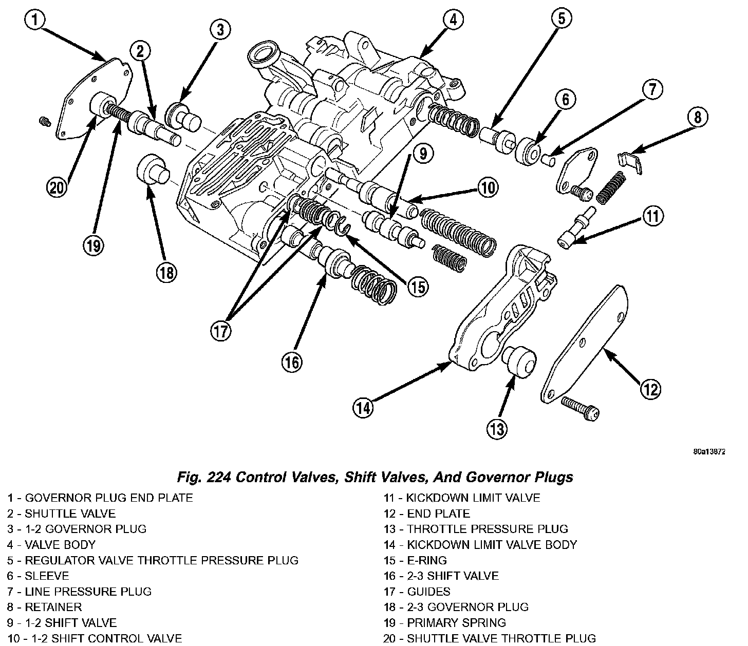 15. Install 1-2 and 2-3 shift valve governor plugs into valve body (Fig. 224). Verify valve components slide freely.