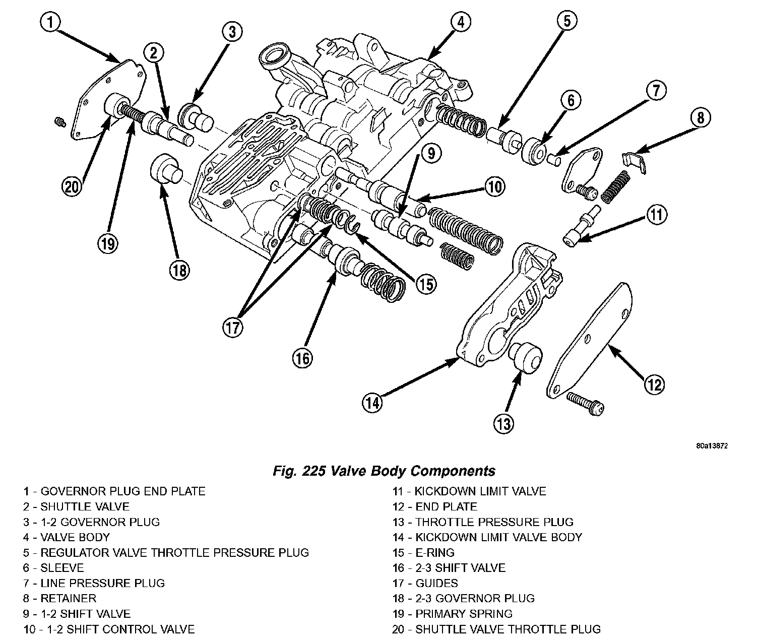 25. Remove shuttle valve throttle plug, primary spring and shuttle valve from valve body (Fig. 224).