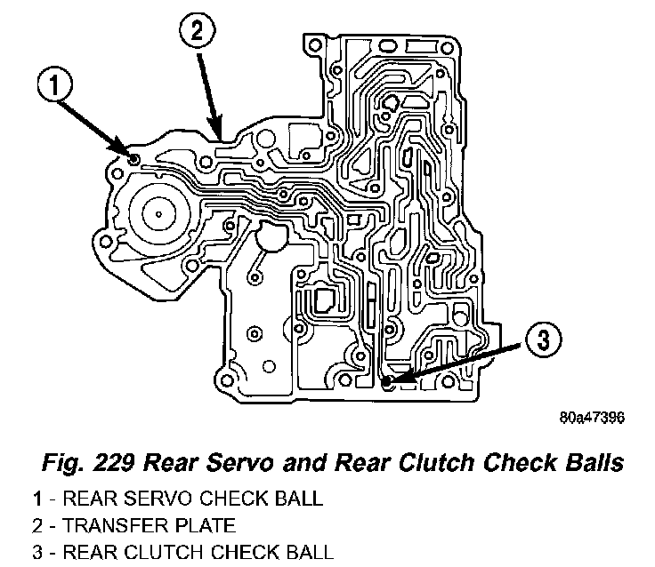 22. Install rear clutch servo and rear servo check balls in proper cavities in transfer plate (Fig. 229).