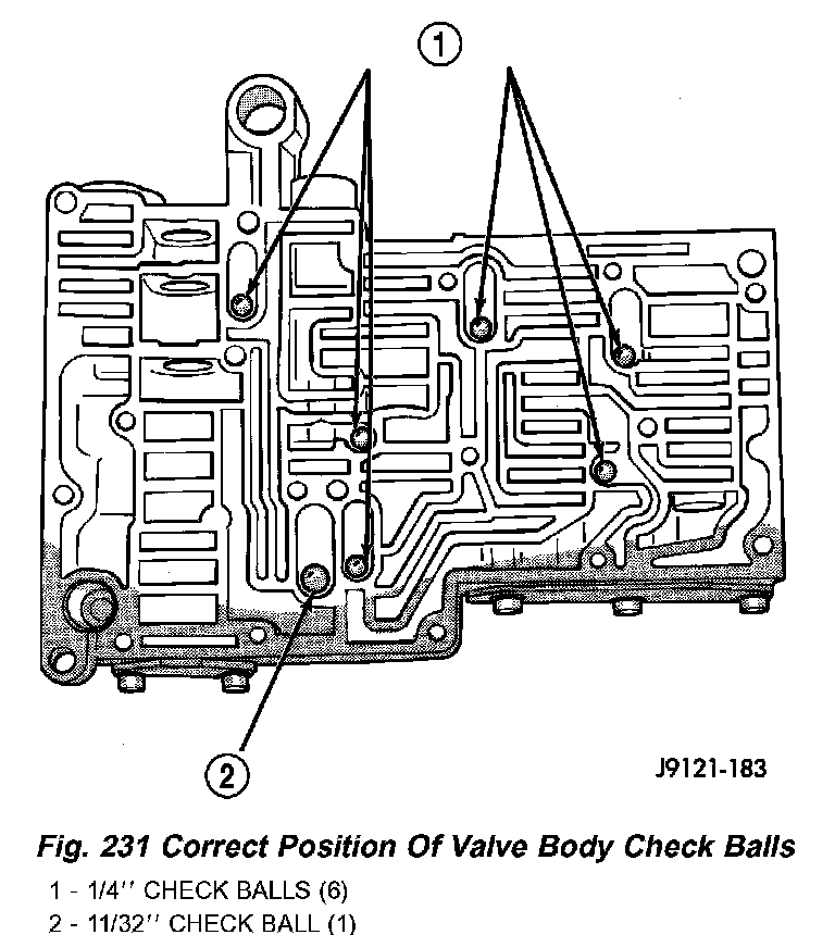 25. Place one 11/32 inch check ball and six 1/4 inch check balls in the proper cavities in the valve body (Fig. 231).