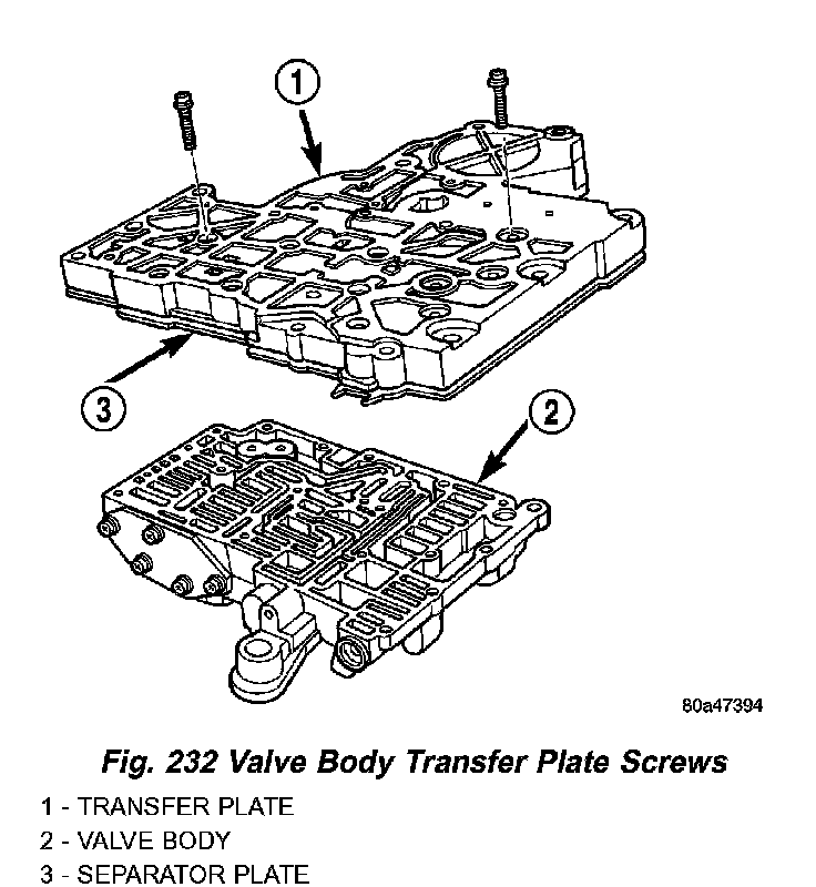 27. Install screws to attach transfer plate to valve body (Fig. 232).