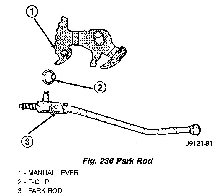 39. If necessary, insert park rod end into manual lever and install E-clip (Fig. 236).