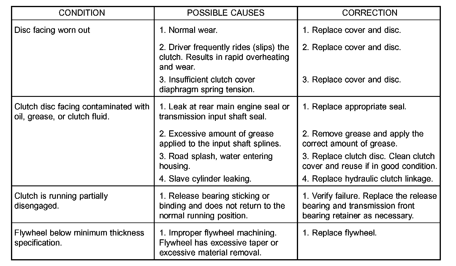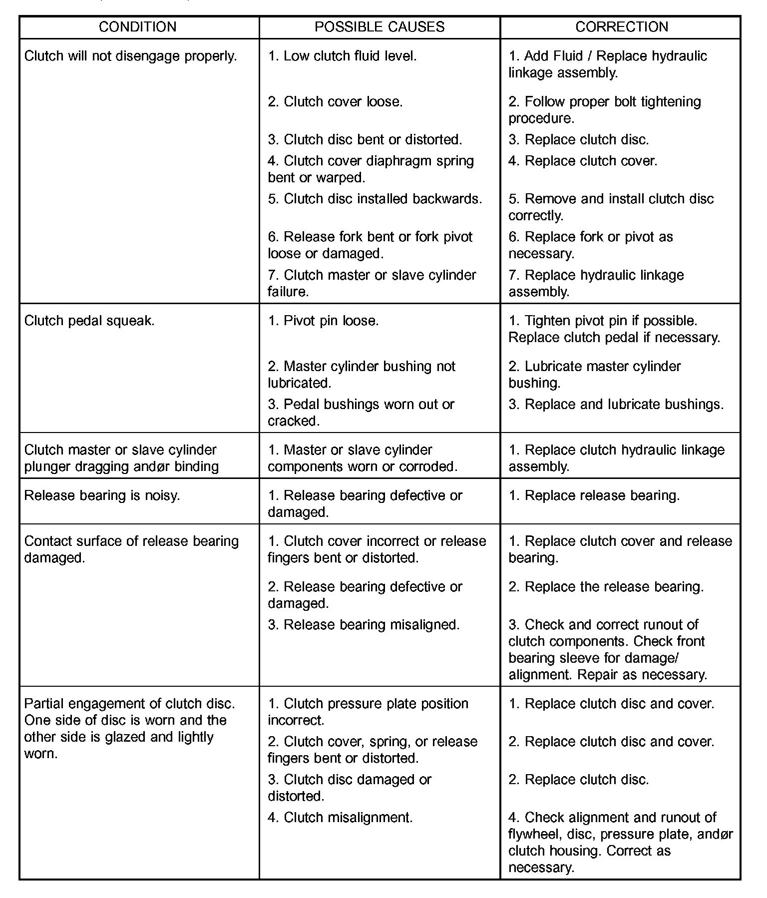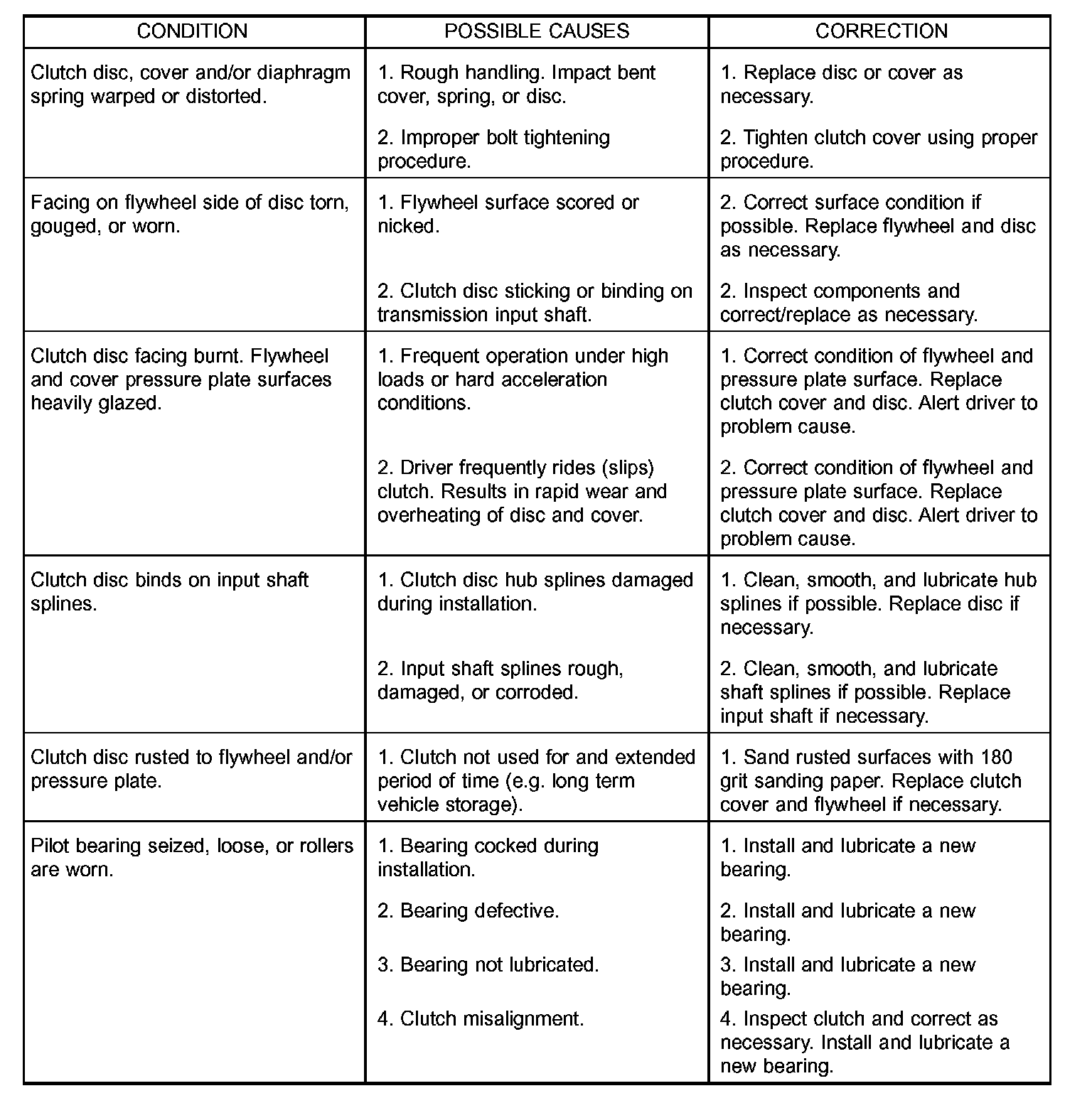 The diagnosis charts Diagnosis Chart describe common clutch problems, causes and correction. Fault conditions are listed at the top of each chart. Conditions, causes and corrective action are outlined in the indicated columns.