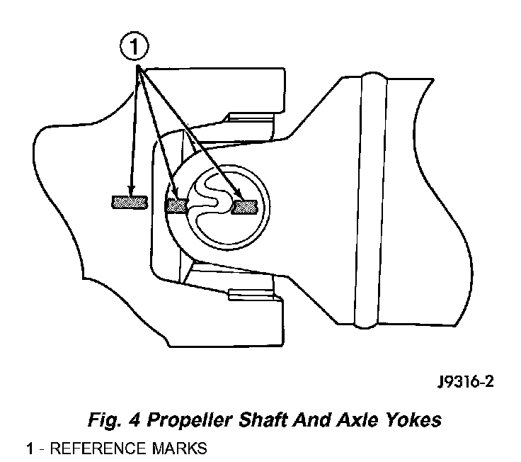 7. Mark rear propeller shaft and rear axle yokes for installation reference (Fig. 4).
