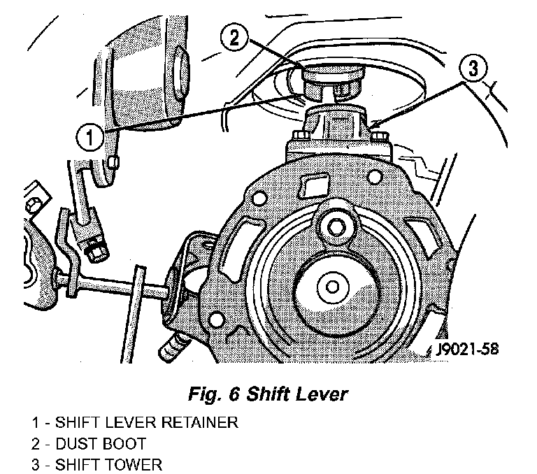 d. Lift lever and retainer out of shift tower (Fig. 6). Do not remove the shift lever from the floor console shifter boots. Leave the lever in place for transmission installation.