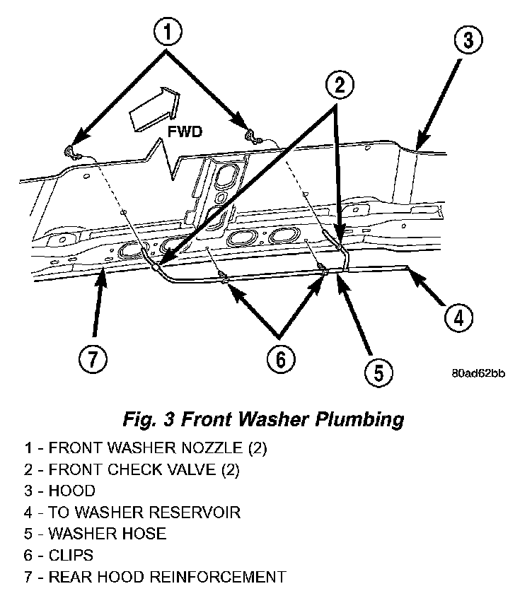 2. Locate the front check valve in the washer supply hose for each front washer nozzle. A check valve is installed between the molded plastic tee fitting and each nozzle near the rear hood panel reinforcement.