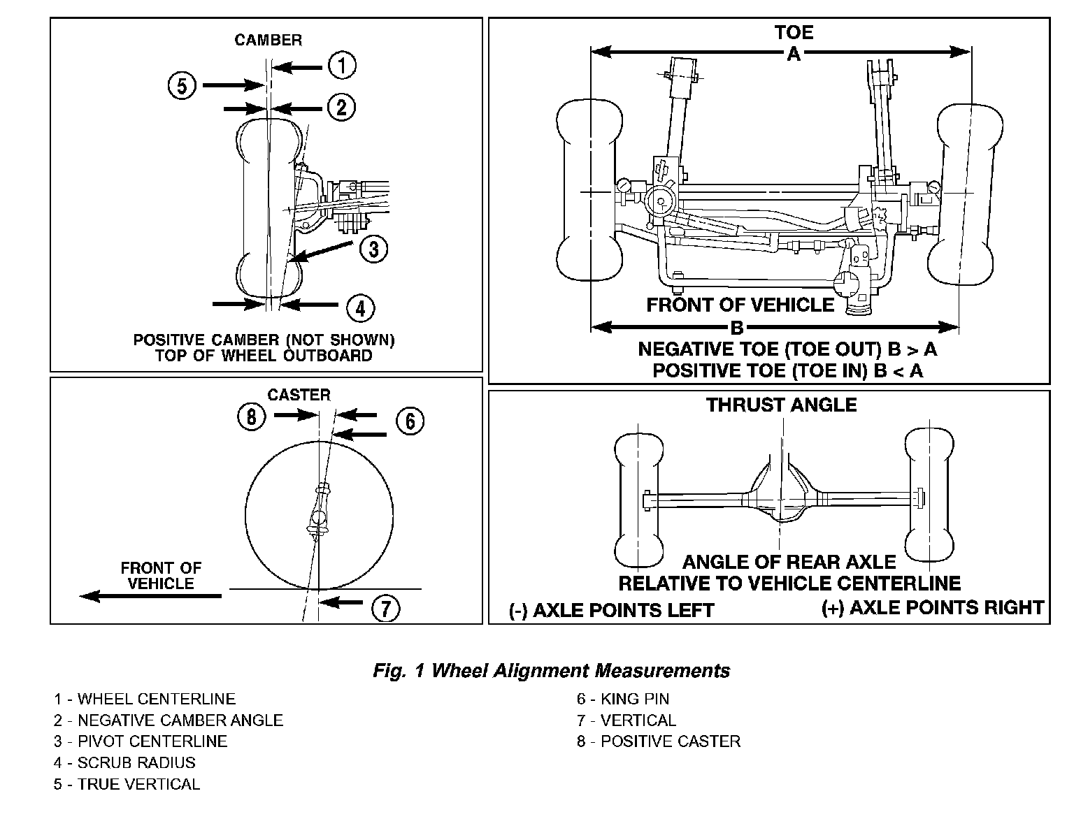 ^ THRUST ANGLE is the angle of the rear axle relative to the centerline of the vehicle. Incorrect thrust angle can cause off-center steering and excessive tire wear. This angle is not adjustable, damaged component(s) must be replaced to correct the thrust angle