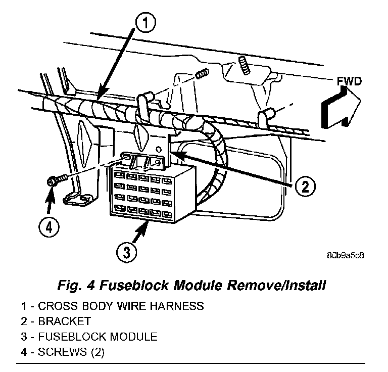 6. Remove the two screws that secure the fuse- block module to the bracket on the dash panel (Fig. 4).