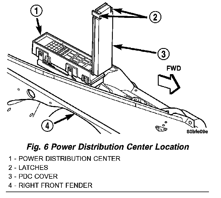 All of the electrical current distributed throughout this vehicle is directed through the standard equipment Power Distribution Center (PDC) (Fig. 6). The molded plastic PDC housing is located on the right side of the engine compartment, forward of the battery on the top of the right front inner fender shield. The PDC houses up to fifteen maxi-type cartridge fuses, which replace all in-line fusible links. The PDC also houses up to thirteen blade-type mini fuses, and up to twelve International Standards Organization (ISO) relays (four standard-type and eight micro- type).