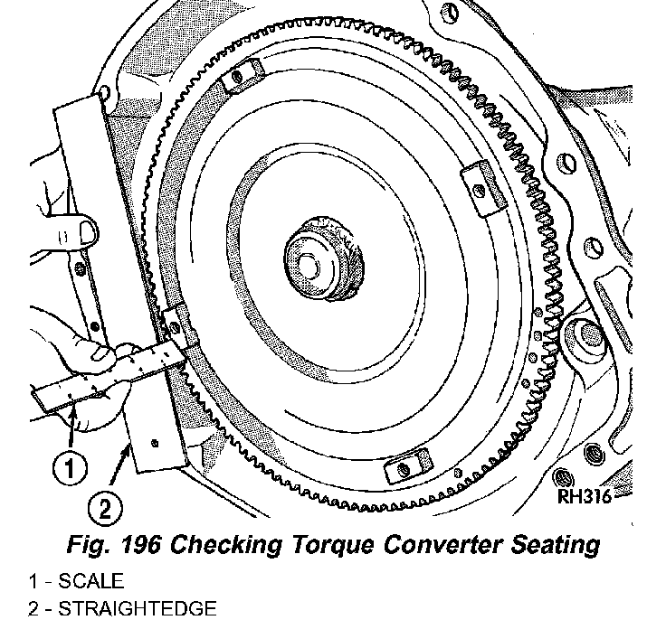 6. Check converter seating with a scale and straightedge (Fig. 196). Surface of converter lugs should be 1/2 inch to rear of straightedge when converter is fully seated.